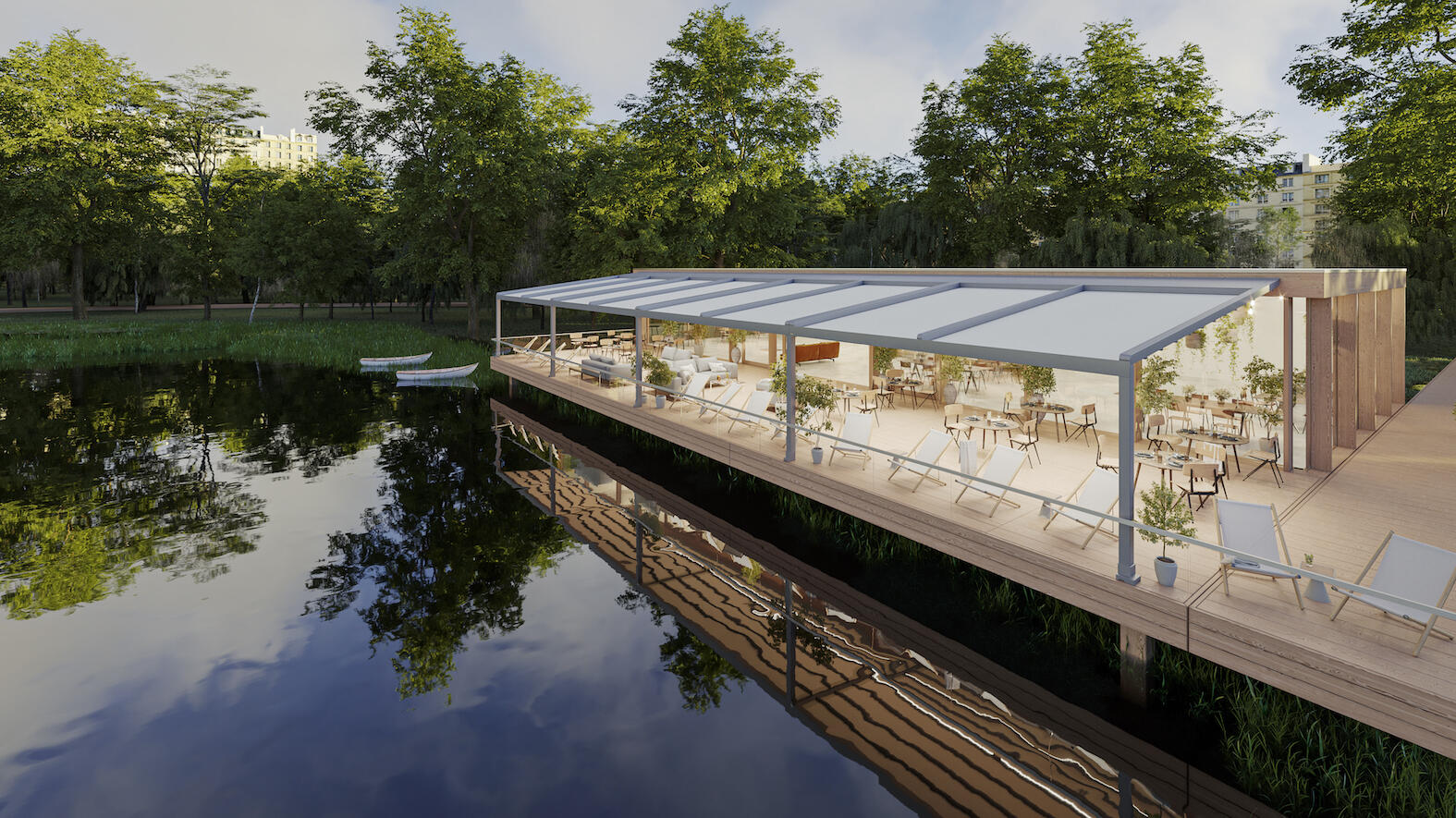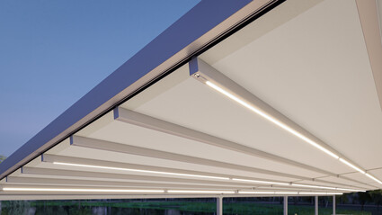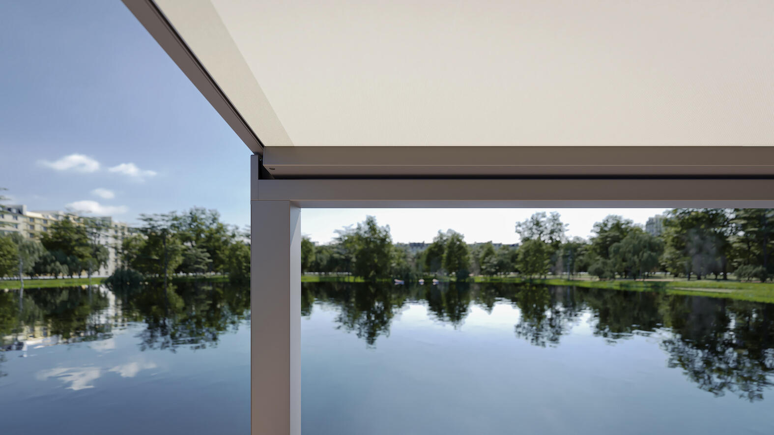 Pergola stretch pro kotvení na dům s látkovou střechou, která se skládá jako baldachýn do subtilního paketu. Vhodná pro krytí velkých ploch.