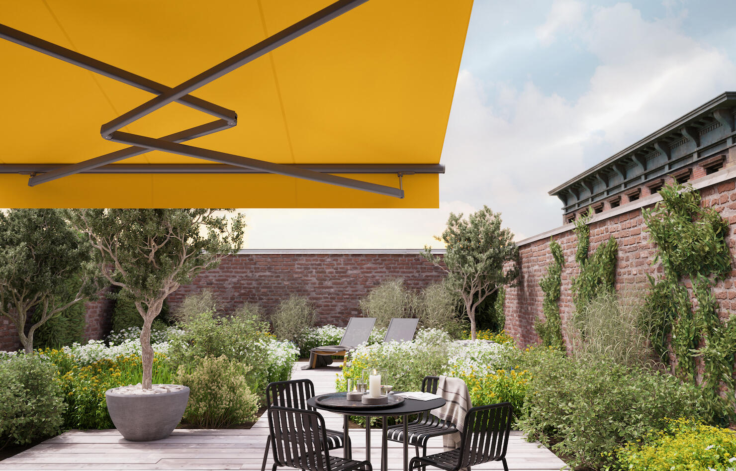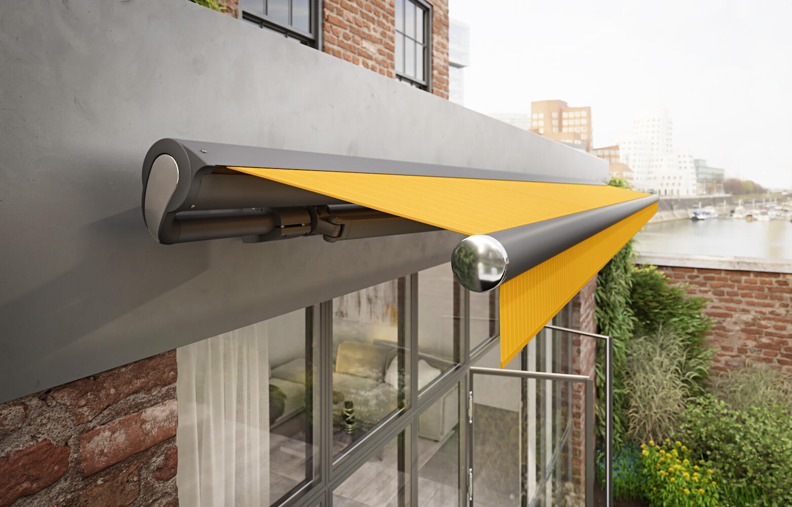 Polokazetová markýza s jedinečným systémem křížení ramen, který umožňuje větší výsun, než je výrobní šíře.